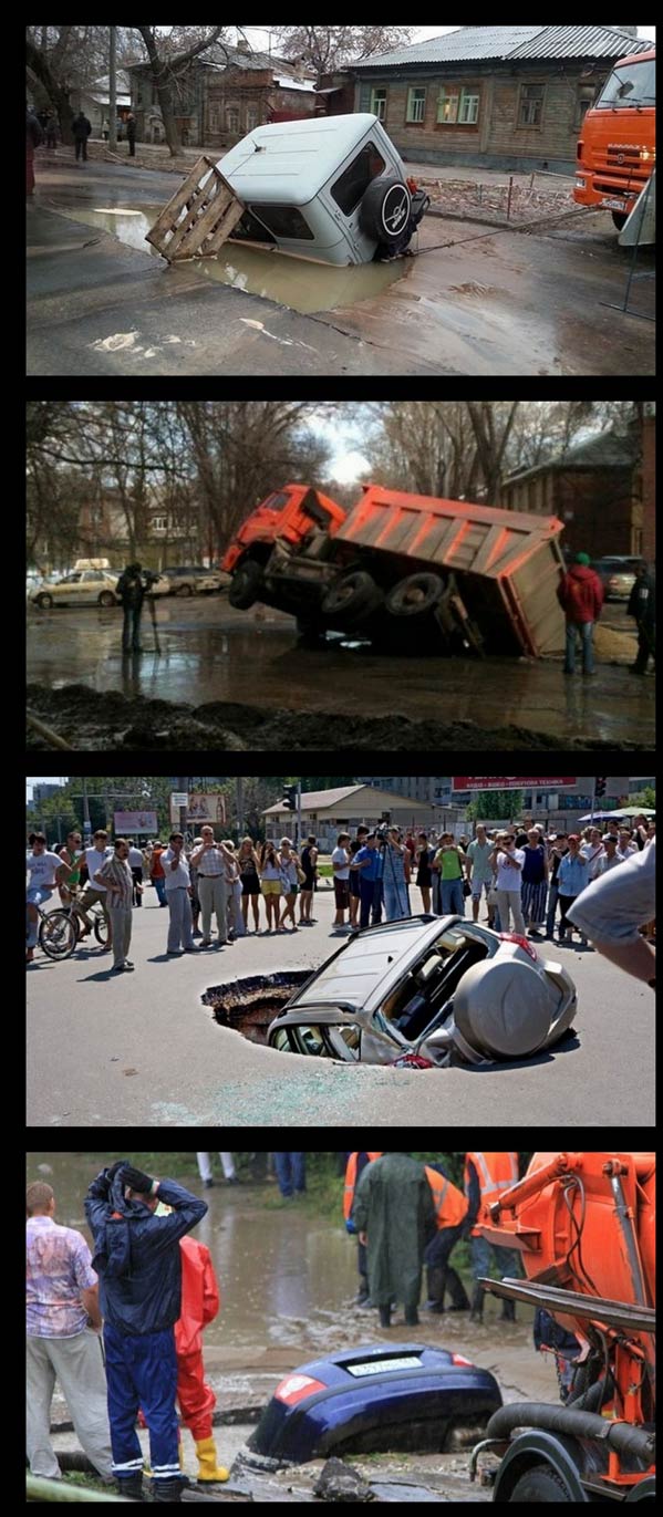 Semalam ramai marah dengan gambar banjir kilat yang melanda Kuala Lumpur. Ini sebenarnya tidak seteruk masalah jalanraya yang menelan kenderaan di Russia. Kerana kekurangan dana, sistem pembentungan bawah tanah di sekitar Russia menjadi usang. Apabila paip bawah tanah ini pecah berlakulah tanah jerlus yang "memakan" kenderaan. Insiden sebegini semakin kerap berlaku di Russia. Bersyukurlah kita rakyat Malaysia kerana jalanraya tidak memakan kenderaan anda. Jangan khufur nikmat yang diberikan kerajaan. Sayangi kereta anda.. Yakini dacing . #Sarcasm